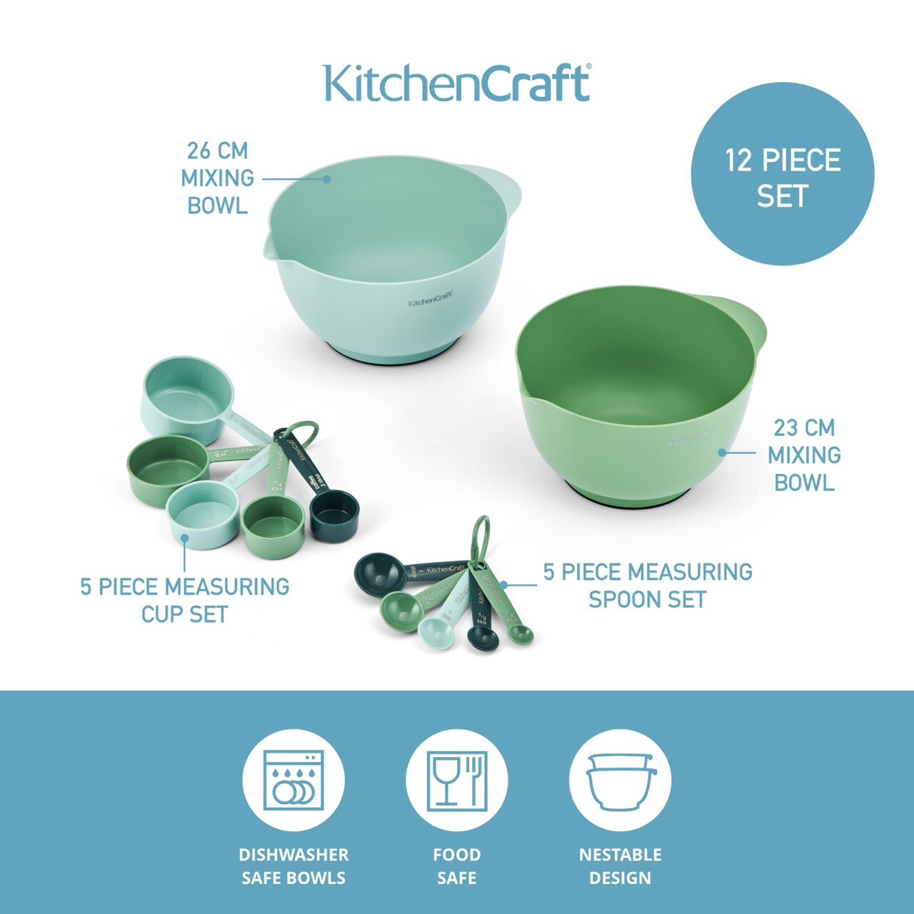 KitchenCraft 12pc Space Saving Stackable Mixing Bowl and Measuring Set, Green and Blue